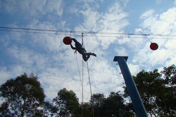 學(xué)員爬上7米高的跳臺,在跳臺上奮力跳出拍打汽球。這個(gè)項(xiàng)目主要訓(xùn)練學(xué)員克服心理障礙、建立良好的心理素質(zhì)及自信心,果斷的
